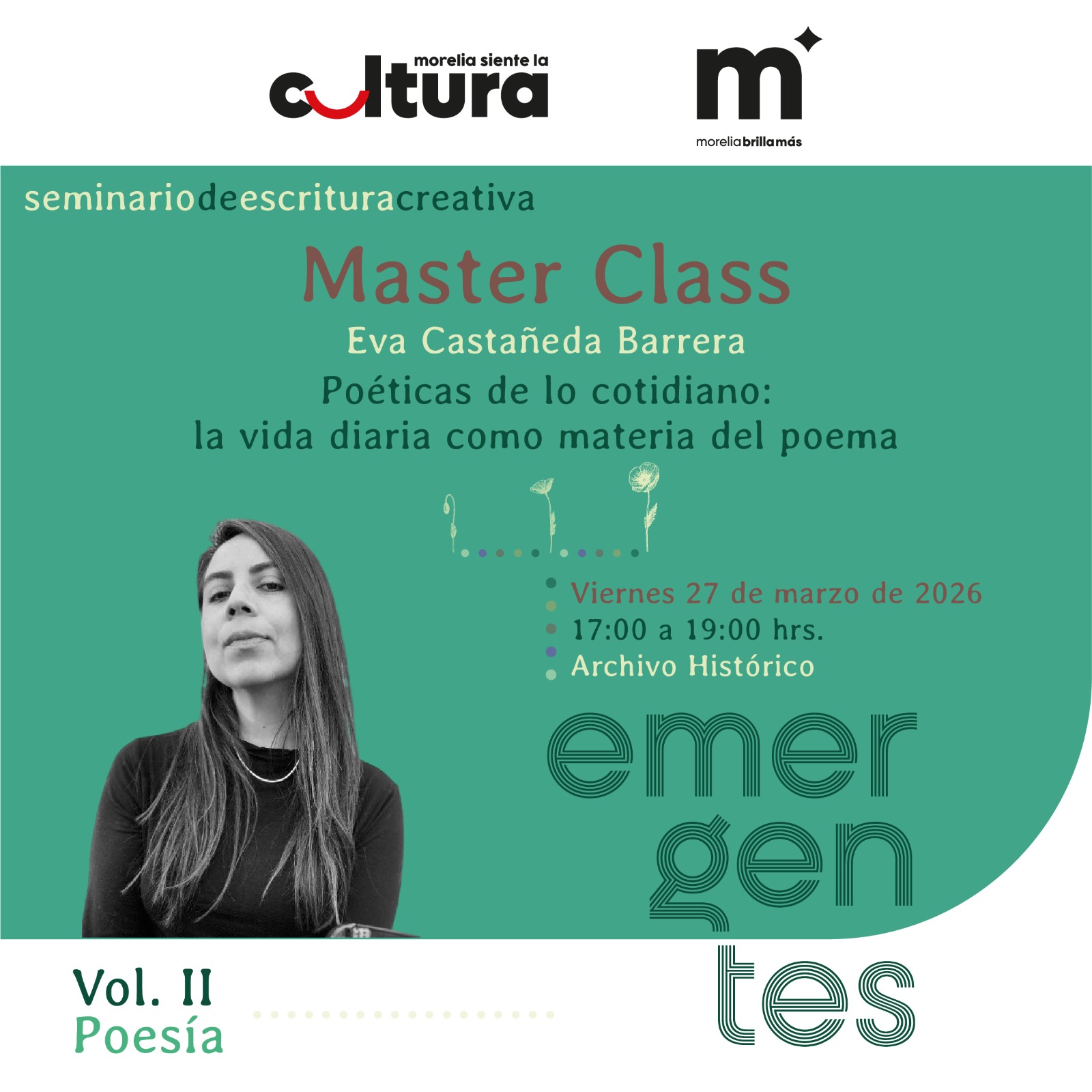 La Secretaría de Cultura de Morelia (SeCultura) invita a la comunidad literaria y al público en general a participar en la master class “Poéticas de lo cotidiano: la vida diaria como materia del poema”, impartida por la escritora Eva Castañeda Barrera, como parte del Seminario de Escritura Creativa Emergentes, Vol. II Poesía.